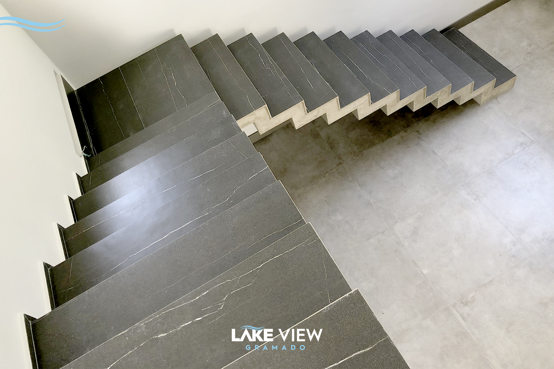 Os degraus foram feitos com peças inteiras, sem emendas. As janelas de cantos foram instaladas com junta seca.